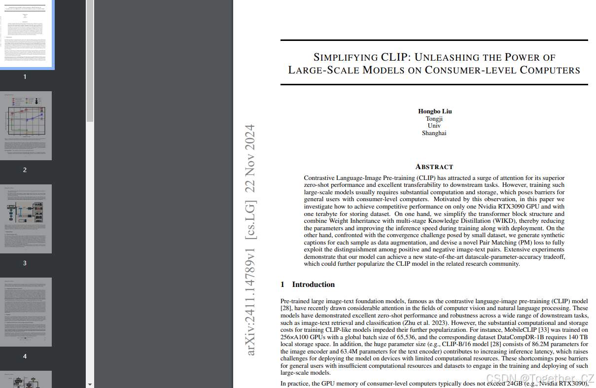 CLIP(对比语言-图像预训练)模型在零样本任务和下游任务迁移中表现出色,但训练这类大规模模型需要大量计算和存储资源,限制了其在消费级计算机上的应用。