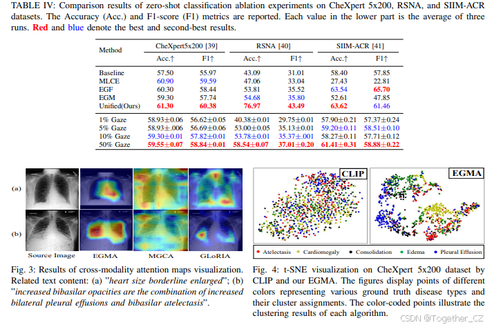 为了更好地展示EGMA框架学习到的文本与放射图像之间的对应关系,我们在图3中进行了跨模态注意力图的可视化。在眼动数据的引导下,EGMA框架在准确定位疾病区域方面明显优于其他最先进的方法。在图4中,我们使用t-SNE可视化了CLIP和我们的EGMA模型在CheXpert 5x200数据集图像上的特征表示。可以观察到,我们的模型表现出更好的聚类表示。未在医学数据上训练的CLIP模型无法有效区分这些疾病。更多t-SNE可视化结果可参考补充材料,其他最先进方法[10, 11]的聚类性能也逊色于我们的EGMA。