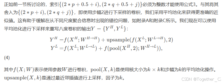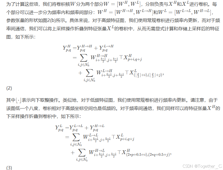 八度卷积算子的实现细节如图2所示。它由四个计算路径组成,对应于公式(4)中的四个项:两个绿色路径对应于高频和低频特征图的信息更新,两个红色路径促进两个八度之间的信息交换。