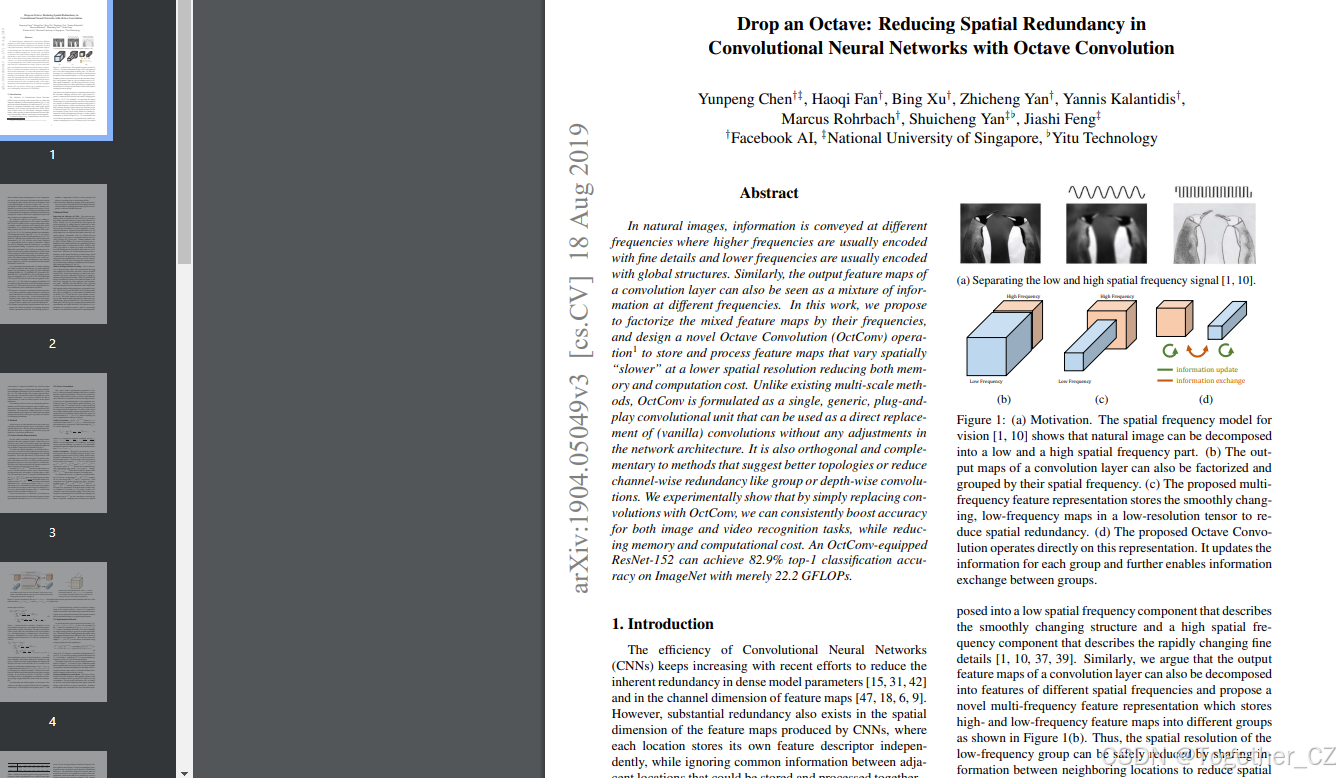 OctConv通过将特征图分解为低频和高频部分,并以不同分辨率进行处理,显著减少了CNN中的空间冗余,同时提升了模型的效率和性能。这里是自己的论文阅读记录,感兴趣的话可以参考一下,如果需要阅读原文的话可以看这里,如下所示: