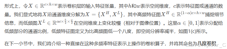 核心创新:提出了八度卷积(OctConv),一种新的卷积操作,能够将特征图分解为低频和高频两部分,分别以不同的分辨率进行处理。低频部分以较低的分辨率存储和处理,从而减少空间冗余。