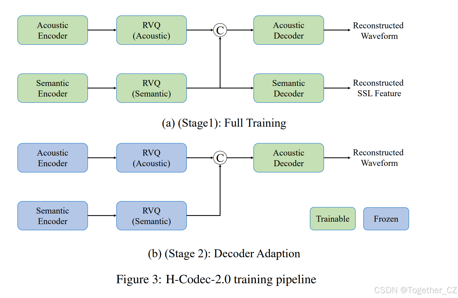 判别器和优化目标函数的配置遵循 UniTok-Audio 中的描述。我们在 H-Codec-2.0 中使用了两阶段训练策略,如图 3 所示。在第 1 阶段,我们在大规模多样化的音频语料库上训练所有模块,增强了在通用音频领域提取令牌的鲁棒性。在第 2 阶段,我们冻结编码器和量化器的参数,以微调声学解码器。此阶段进一步专业化声学解码器,使其能够从固定的量化特征重建音频,而无需适应变化的量化特征。