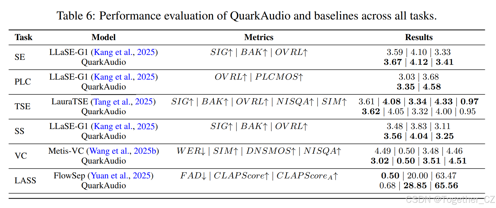 表 6:QuarkAudio 和基线在所有任务上的性能评估。