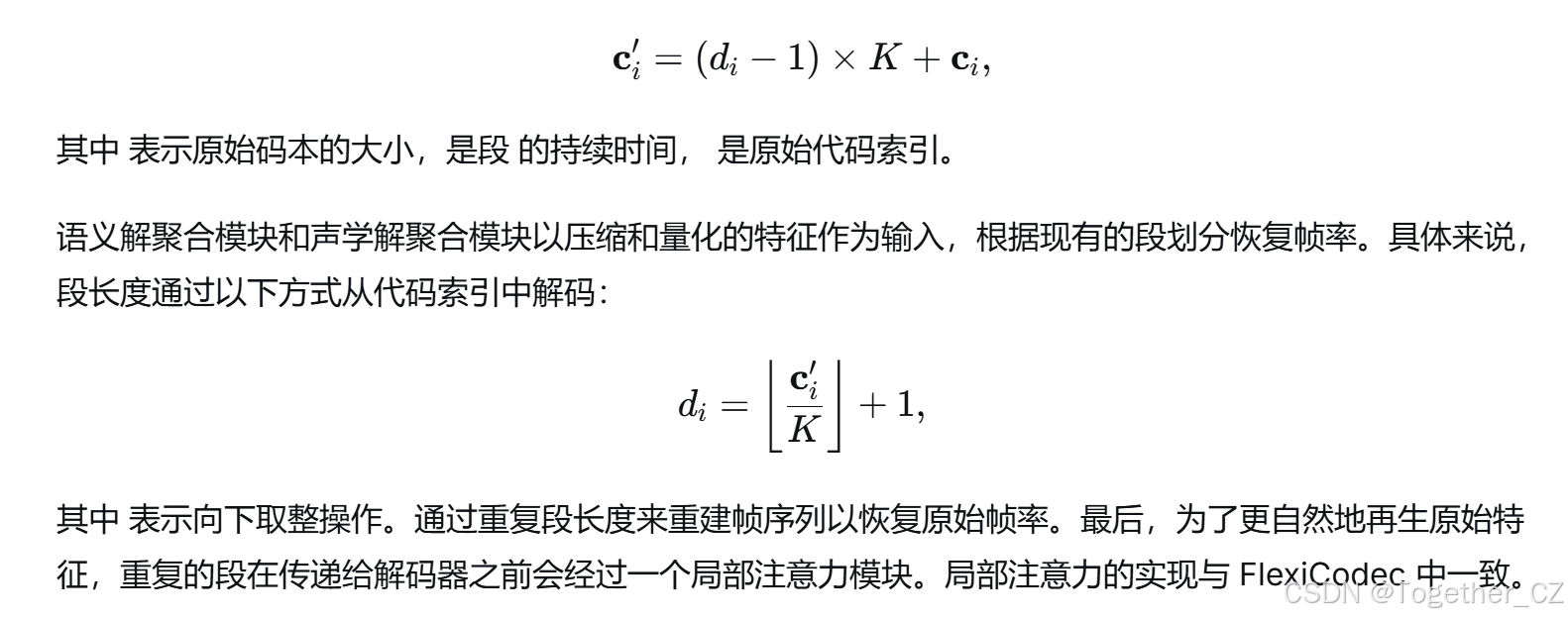 语义聚合模块首先计算所有相邻语义特征之间的余弦相似度得分,其中语义特征序列由语义编码器提取。然后扫描相似度序列,以识别所有相似度得分超过预定义阈值的多个连续段。对于每个识别的段,帧随后通过局部注意力机制映射为单个特征表示。声学聚合模块继承由语义聚合模块确定的段边界,以指导声学特征的压缩。这种设计实现了语义引导的声学特征压缩,同时确保跨特征维度的时间一致性。此外,为了便于在解码期间恢复原始帧率,我们遵循 VARStok 的设计,将段长度嵌入到最终的代码索引中,如下所示: