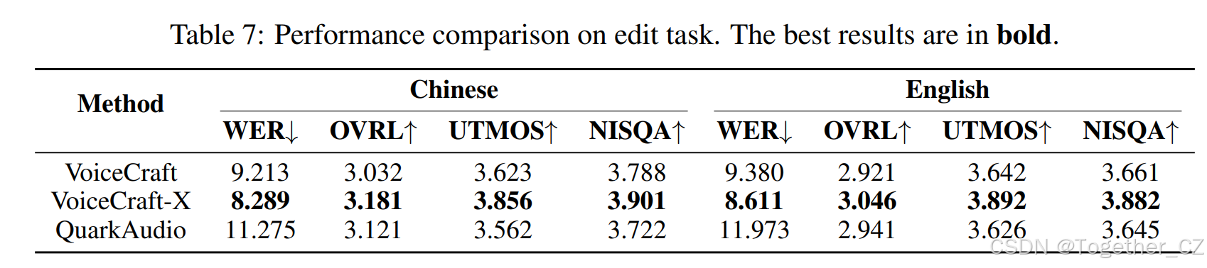 结果:表 7 总结了 EDIT-S 任务的客观结果,QuarkAudio 在 OVRL、UTMOS 和 NISQA 方面实现了与 VoiceCraft 相当的语音质量,展示了强大的信号重建保真度和自然度。然而,它表现出更高的 WER,这可归因于当前框架由于缺乏显式令牌级建模的端到端编解码器架构而导致的较弱语义对齐。正在进行的工作侧重于通过辅助监督改进语义瓶颈,以提高文本准确性而不影响音频质量。