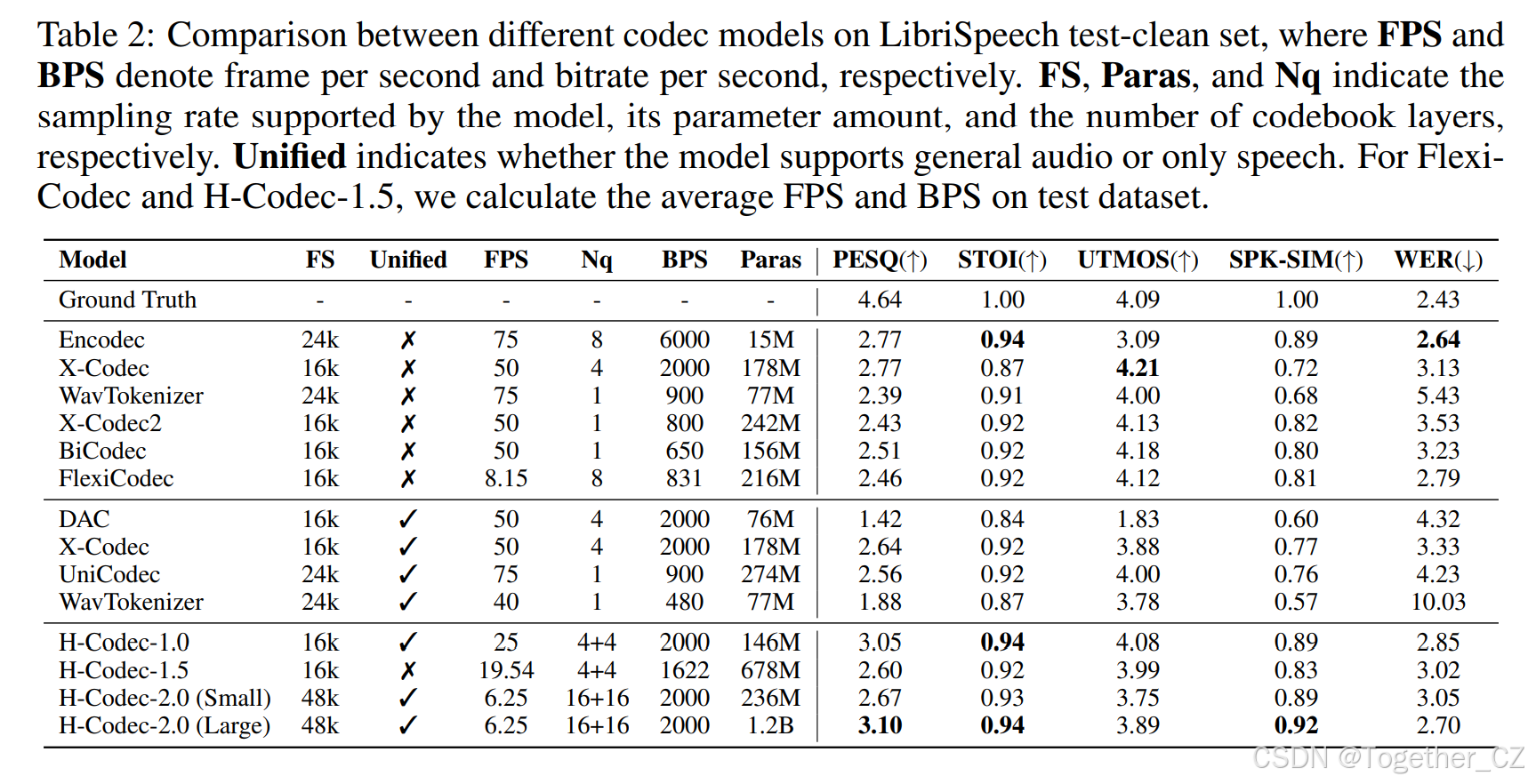 表 2:不同编解码器模型在 LibriSpeech test-clean 集上的比较,其中 FPS 和 BPS 分别表示每秒帧数和每秒比特率。FS、Paras 和 Nq 分别表示模型支持的采样率、参数数量和码本层数。Unified 表示模型是否支持通用音频或仅支持语音。对于 Flexi-Codec 和 H-Codec-1.5,我们计算测试数据集上的平均 FPS 和 BPS。
