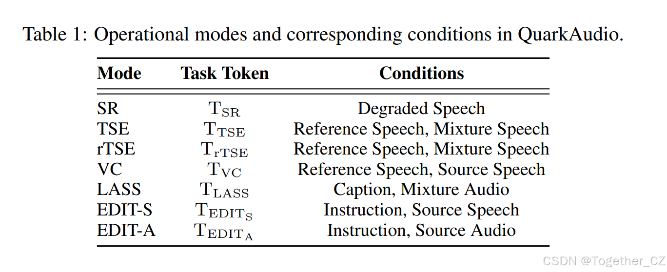 用于生成的统一音频语言模型:QuarkAudio 通过将任务特定的条件信息作为仅解码器语言模型的条件序列来统一任务,并以自回归方式预测目标音频的离散令牌。我们使用特殊的任务令牌来区分多个任务的不同学习模式。请注意,我们的模型使用一组共享权重处理多样化任务,从而消除了对任务特定权重适应的需求。