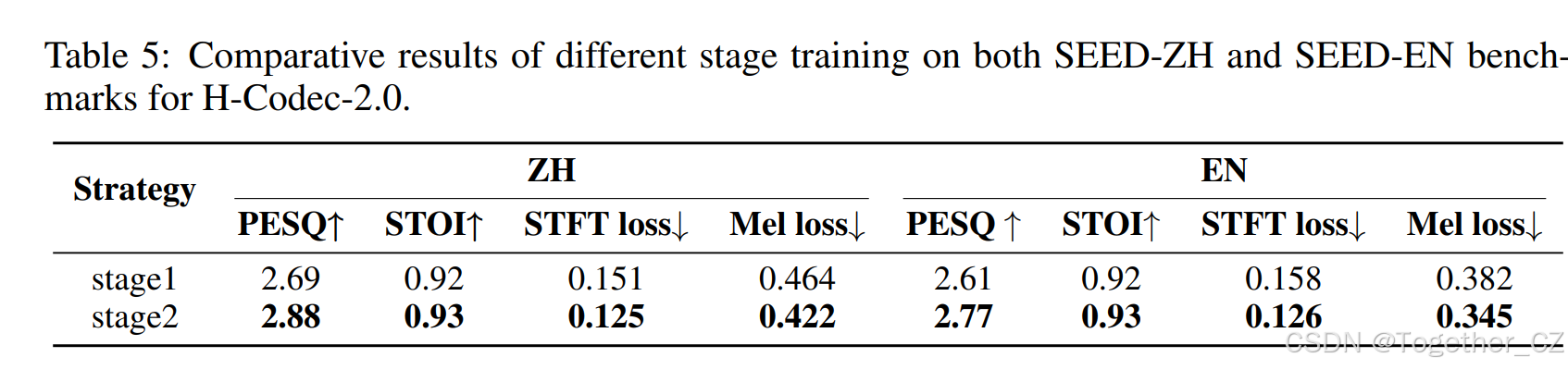 表 5:H-Codec-2.0 在 SEED-ZH 和 SEED-EN 基准上不同阶段训练的对比结果。
