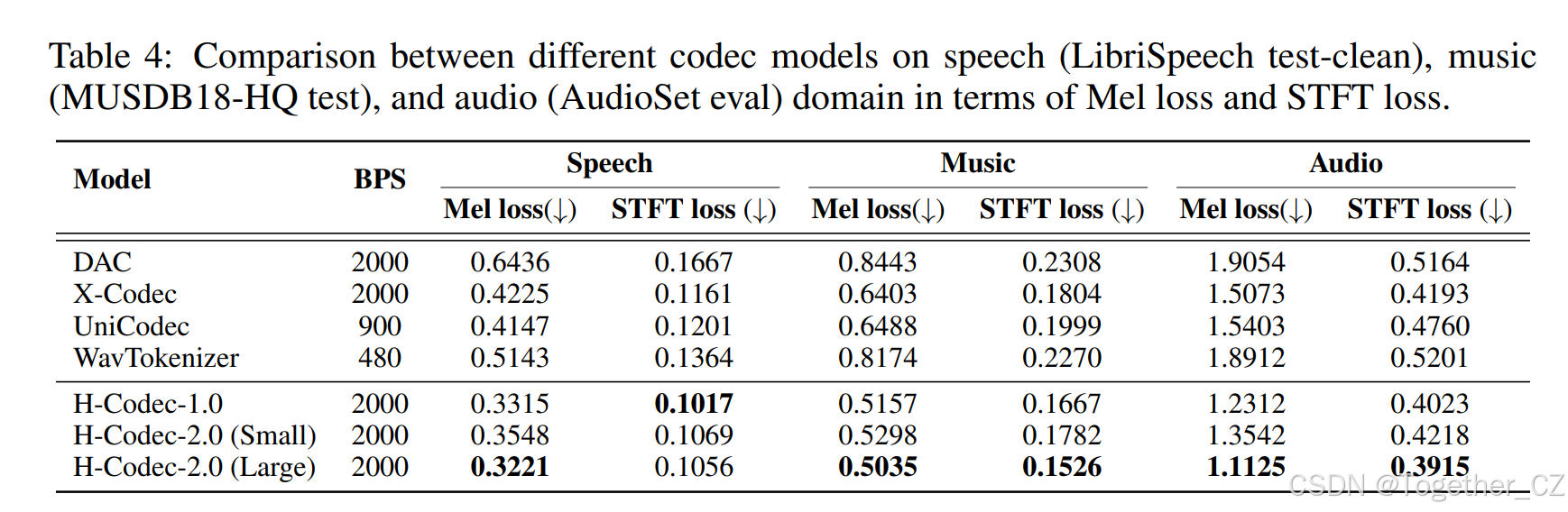 表 4:不同编解码器模型在语音、音乐和音频领域就梅尔损失和 STFT 损失方面的比较。