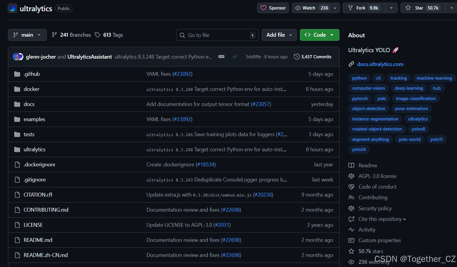 ultralytics项目自发布以来目前已经逐步迭代至YOLOv11了,不可谓不快速,官方的项目在这里,如下所示: