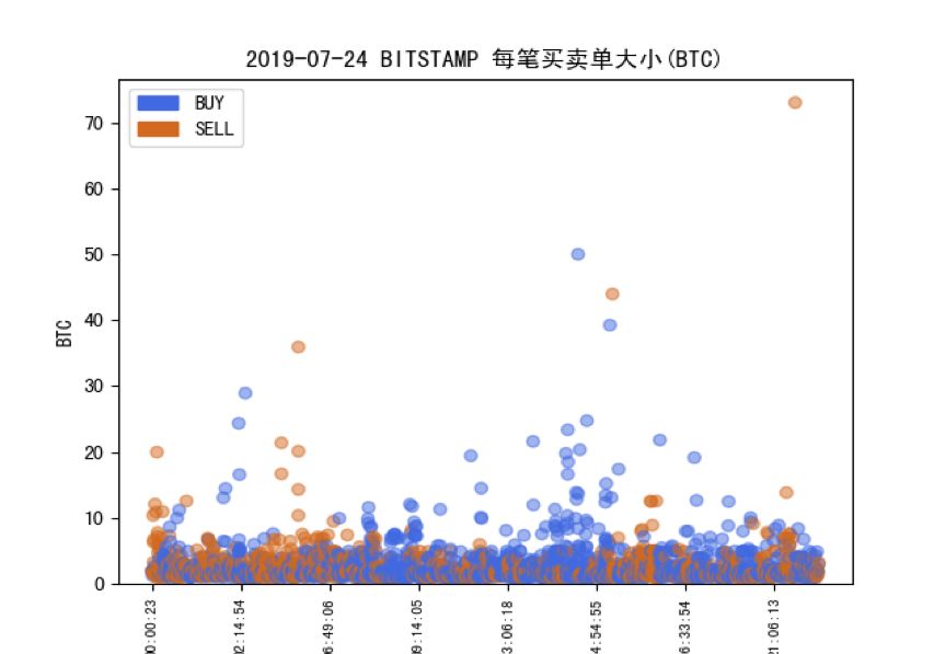 从每笔成交的大小上可以看到,在14:00-15:00间,Bitstamp上有很多10-25 BTC的买单,而没有看到有较大的卖单。其它两个交易所的买卖单大小分布比较均匀,因此这段价格上涨更有可能是Bitstamp推动的。