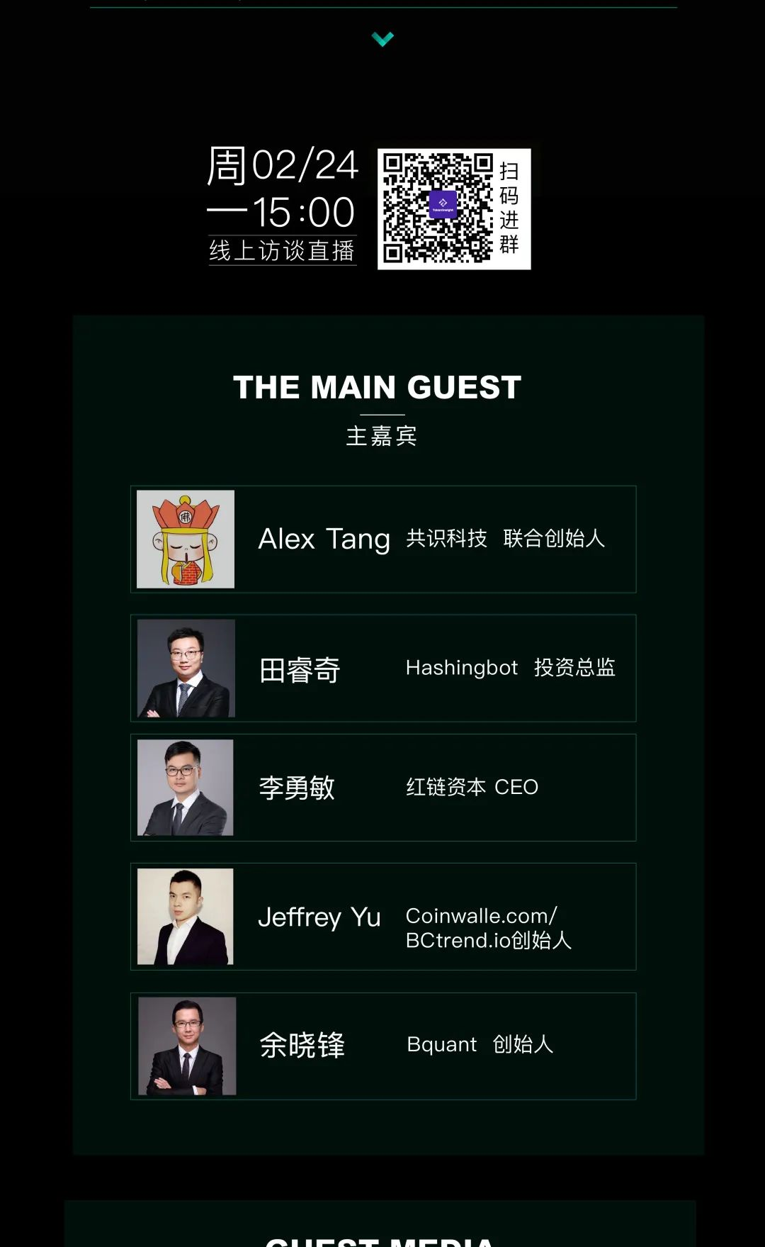 下周一(2月24日)下午3点,TokenInsight《对话首席》第33期即将举办。本期我们邀请到了共识科技 联合创始人-Alex Tang、Hashingbot 投资总监-田睿奇、红链资本 CEO-李勇敏、Coinwalle.com/BCtrend.io创始人-Jeffrey Yu、Bquant 创始人-余晓锋,共同谈一谈量化角度下的数字资产市场,扫描海报二维码或公众号后台回复进群,即可加入活动社群。