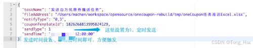 我们创建一条定时发送类型的优惠券分发任务。发送时间参数设置小于当前时间即可,方便触发
