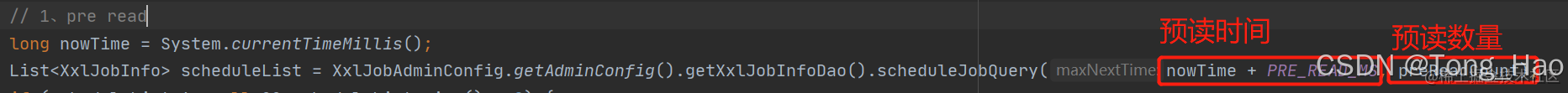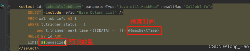 - 对目标方法(例如推送任务发送到MQ)添加@XxlJob注解,并启动XXL-Job。这时调度中心会启动一个线程不断监听xxl_job_info表筛选即将触发的任务,源码中的条件如下: