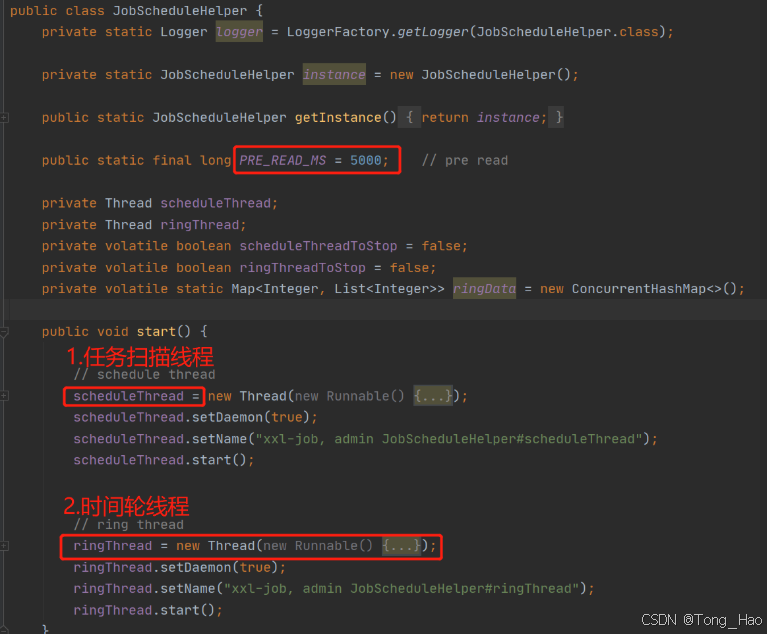 调度中心做的第一件事,就是启动一个线程不断的扫描定时任务配置表 xxl_job_info,我们可以从初始化方法 com.xxl.job.admin.core.scheduler.XxlJobScheduler#init 中找到这个线程的初始化过程,如下图: