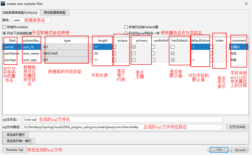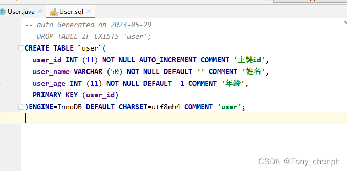点击ok后在sql文件路径中打开生成好的User.sql文件