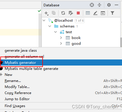 在Database中选中user表,右键选择Mybatis generator自动生成Mapper和Mapperxml