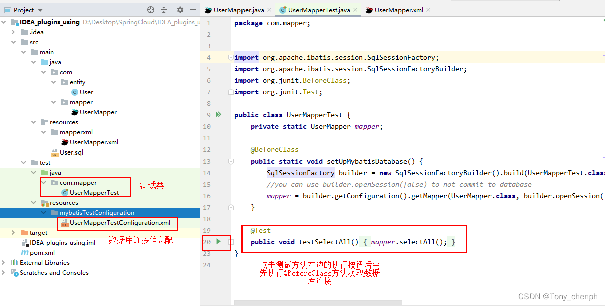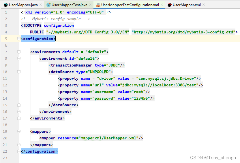 MyBatisCodeHelperPro帮助我们生成了UserMapperTestConfiguration.xml配置数据源信息,里面的属性值就是上一步填写的数据库信息