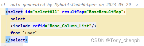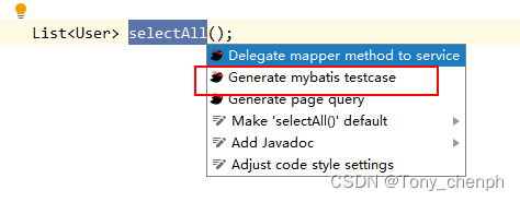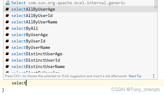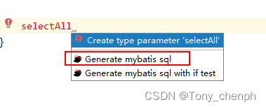 输入select/update/insert/delete可以看到插件给我们提示了很多方法定义让我们选择,也可以自己手动输入自己想要的方法名。
