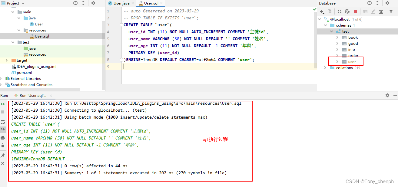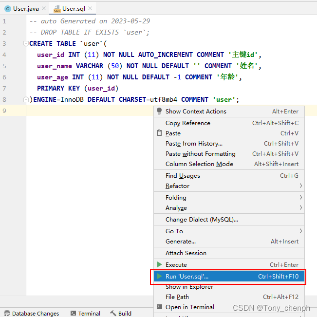 可以在Database中打开sql语句执行控制台并将sql语句复制到控制台中执行,也可以直接在User.sql文件中右键选择Run ”xxx. sql”直接执行