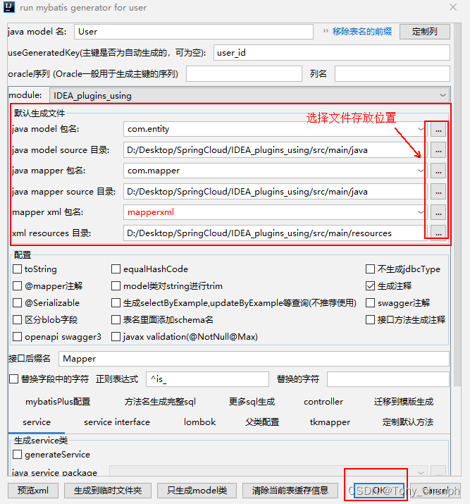 设置后生成的mapper和mapper.xml文件存放位置的参数和配置后点击ok
