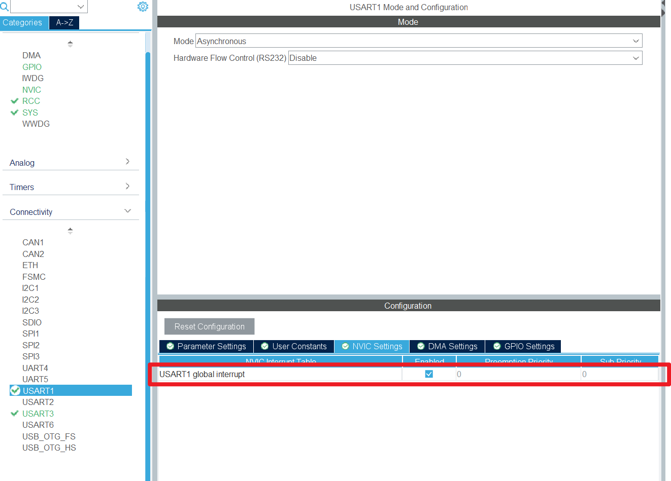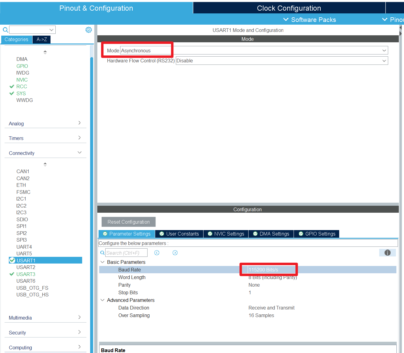串口1与串口3的配置都是一样的,选择异步,波特率选择115200,并且打开串口中断,其他默认。