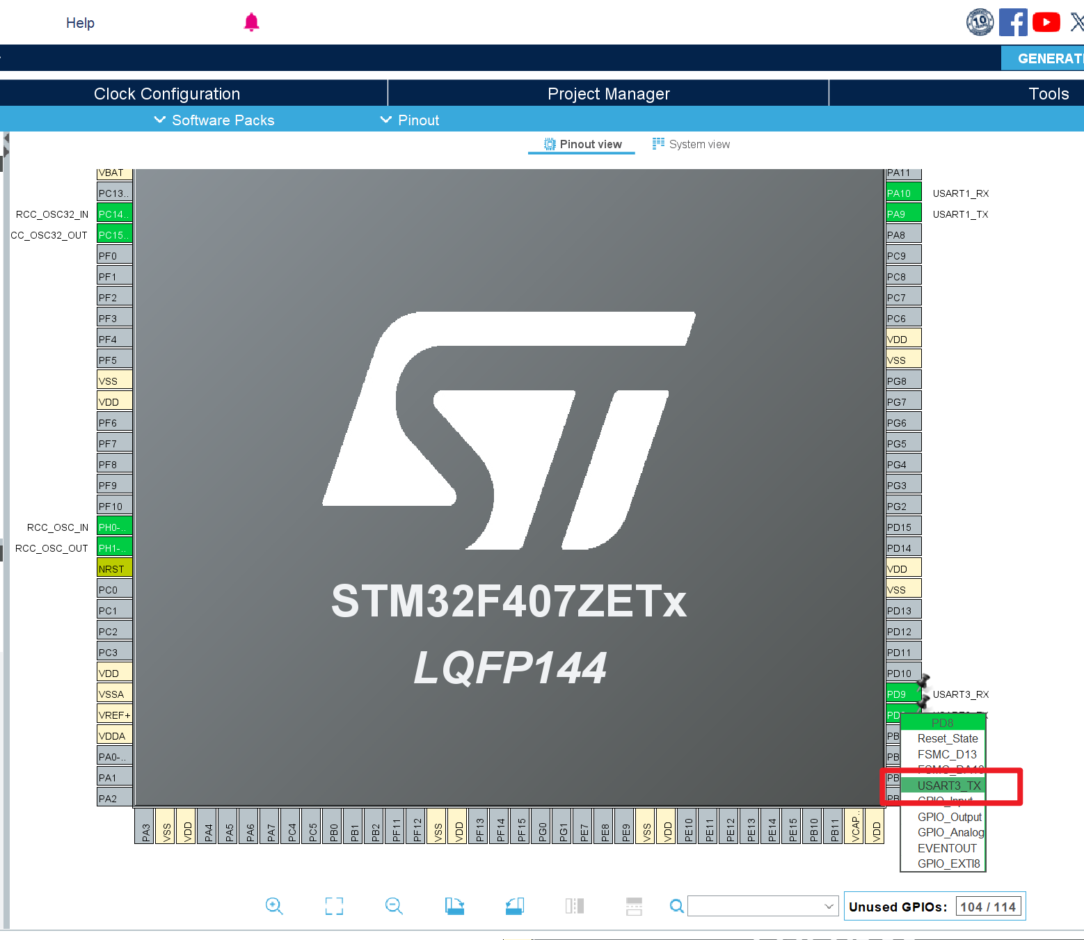 由于与FPGA连接的引脚是PD8与PD9,在这里还要对引脚进行更改(默认的不是这个引脚)