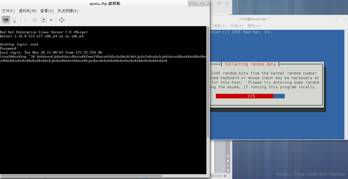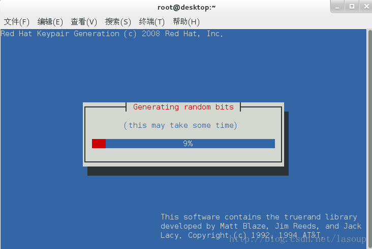 到这一步需要到发布服务的主机上不停的随机敲字母,否则进度条会一直停止不动。具体原因与/dev/random文件有关,随机敲字母这个文件会随之增大: