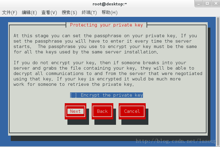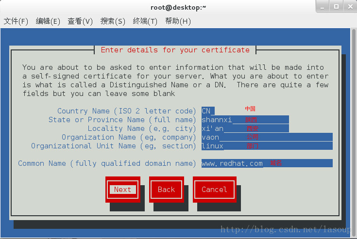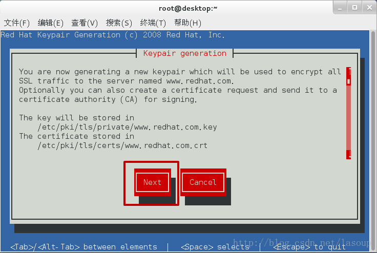 yum install crypto-utils -y #安装ssl生成工具genkey www.redhat.com #执行命令运行ssl生成工具进入文本化图形
