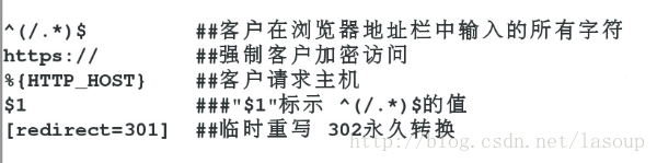 RewriteRule ^(/.*)$ https://%{HTTP_HOST}$1 [redirect=301] #网页重写规则,^(/.*)$用户输入的内容;https://%{HTTP_HOST}转换成https格式;$1代表用户刚才输入的内容;[redirect=301]临时转换