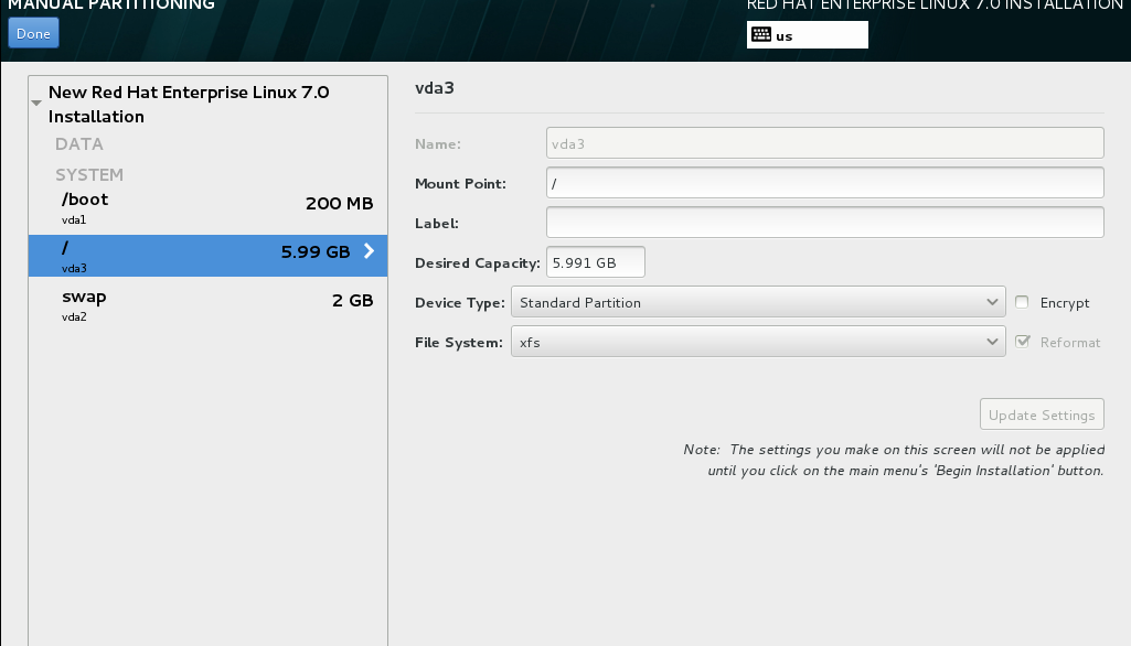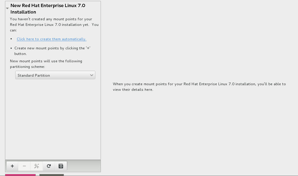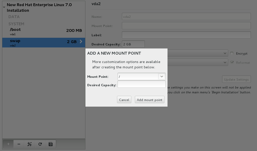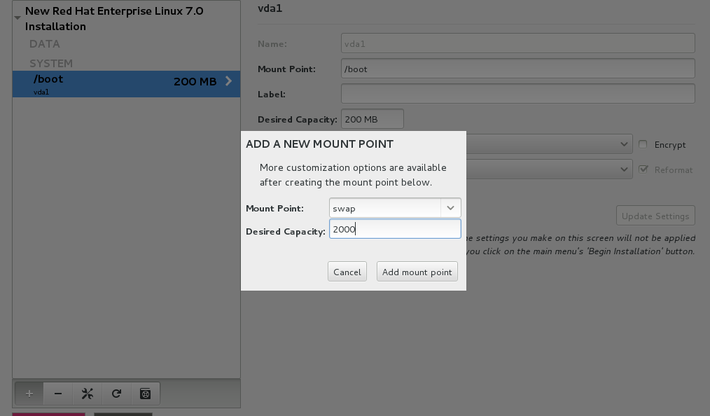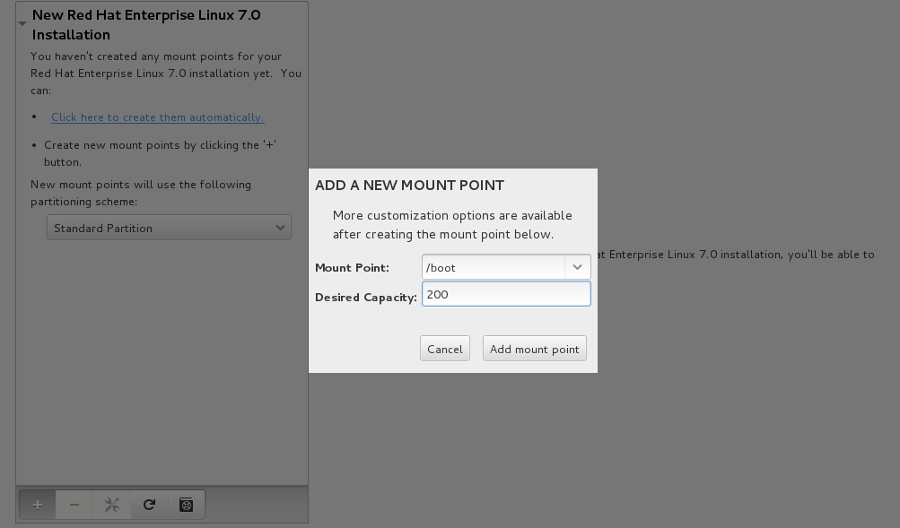 点击左下角的+,创建200M的boot分区(也可以不要这个分区)、2G的swap分区(一般为物理内存的2倍)、剩余的硬盘全部分给根分区,这里为空即表示剩余全部。