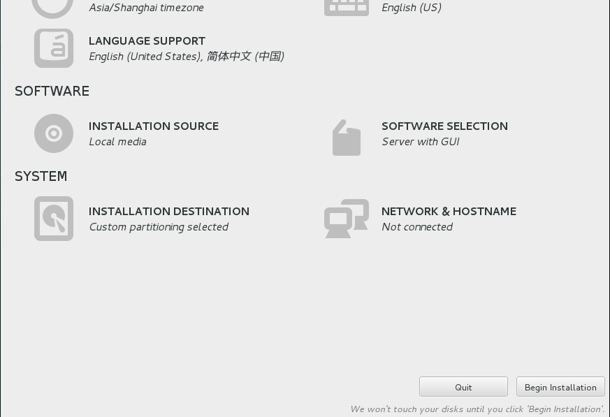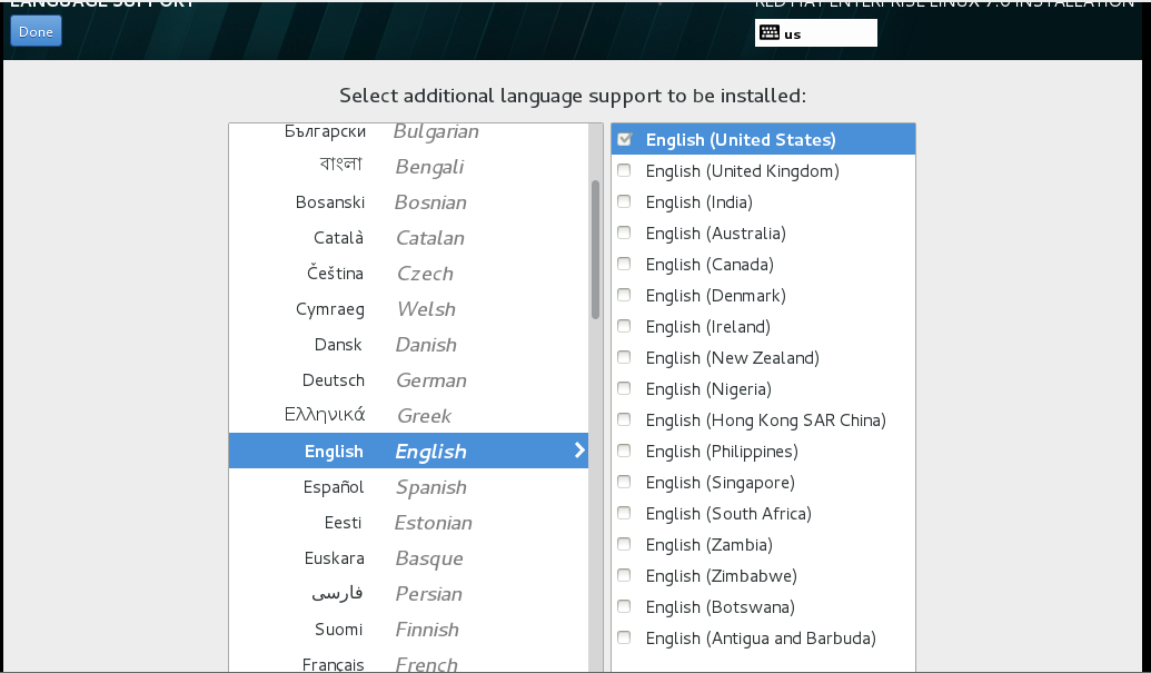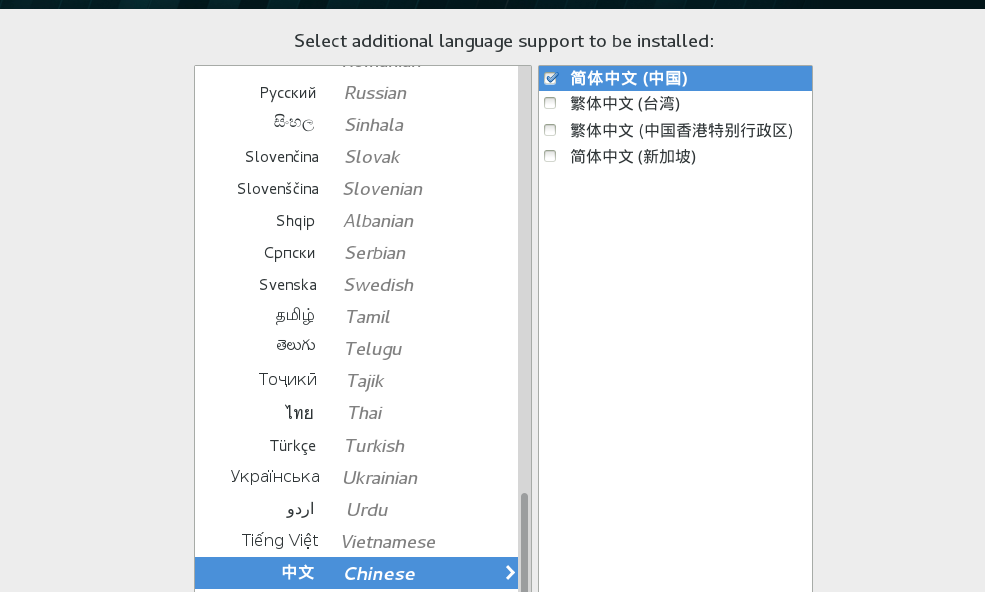这里选择系统支持的语言,除了默认的英文外还要选上中文支持,否则系统中的中文可能会显示为乱码