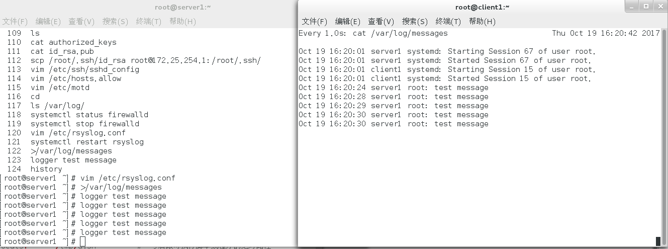 首先在发送端使用logger test message命令发送test日志