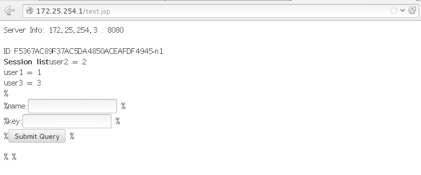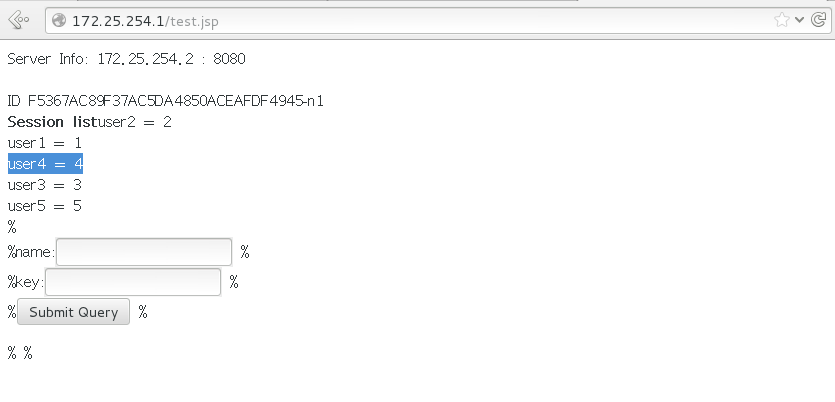 当客户端访问172.25.254.1(server1)时,会自动分配给server2或者server3(基于缓存的)。当分配给server2上的tomcat时,关闭server2服务(bin/shutdown.sh),会自动取server2在server3主机上备份的session,使用户操作不消失