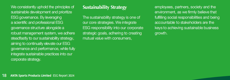 我们翻阅了《安踏集团2024年度ESG报告》,第18页写道:We integrate ESG responsibility into our corporate strategic goals, adhering to creating mutual value with consumers, employees, partners, society and the environment, as we firmly believe that fulfilling social responsibilities and being accountable to stakeholders are the keys to achieving sustainable business growth. (我们将 ESG责任融入公司战略目标,坚持与消费者、员工、合作伙伴、社会和环境共同创造价值,因为我们坚信履行社会责任和对利益相关者负责是实现可持续业务增长的关键。)