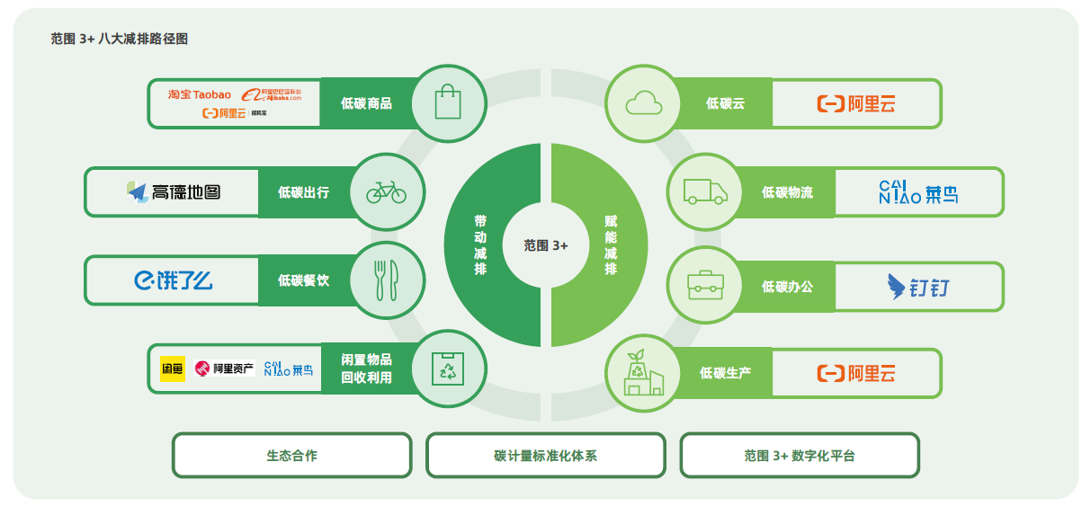 阿里不仅制定了必要的减碳目标(即2030年自身运营碳中和,价值链碳强度减半),还提出了“范围3+”的理念。“范围3+”是那些虽然不在阿里自身产业链范围内,但是能够通过带动或赋能实现的减碳。集团承诺,要在15年内实现15亿吨的减排。