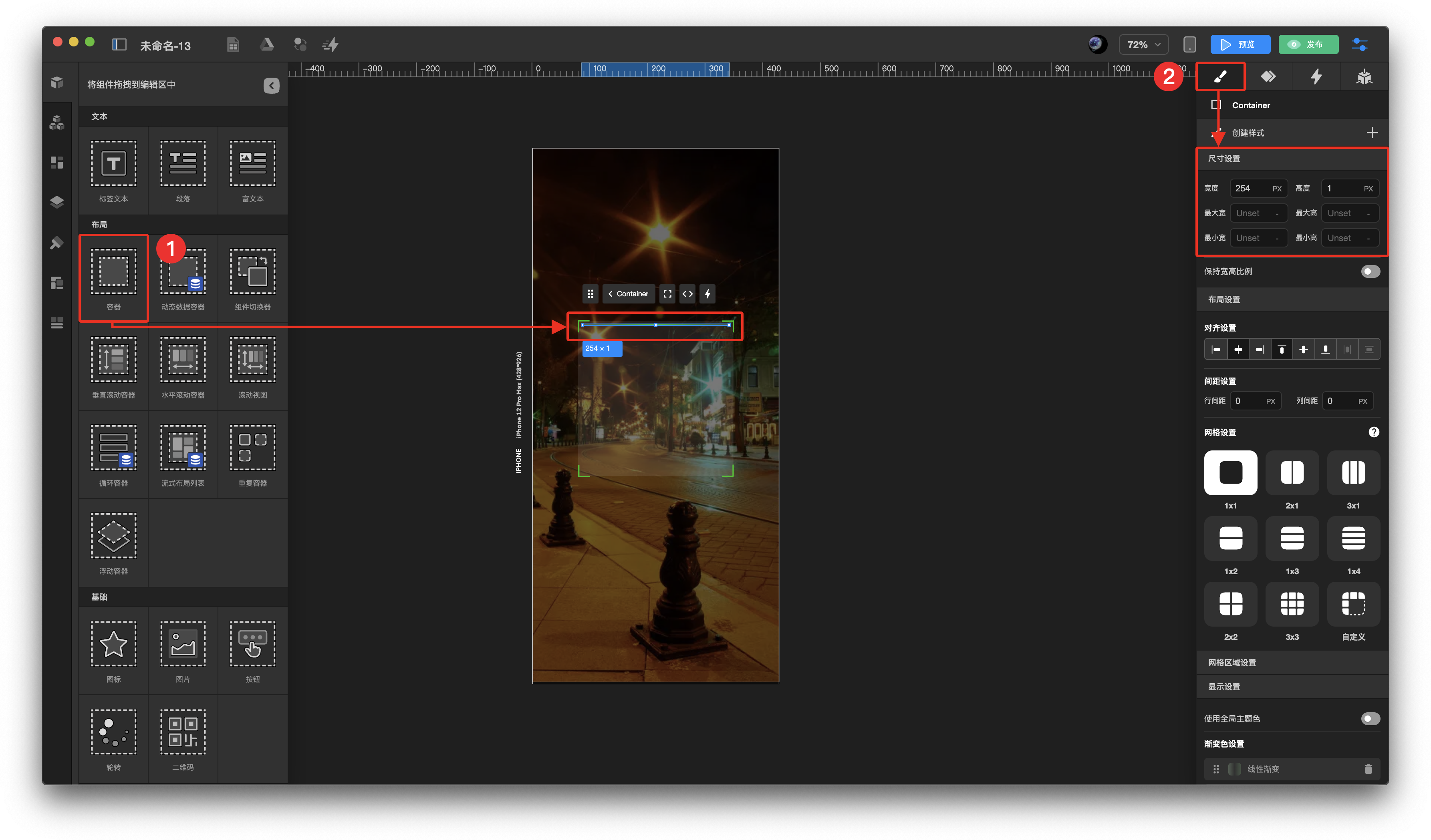 在右侧面板 样式 中 尺寸设置 设置 宽度 高度 数据