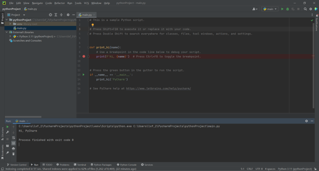 设置完毕,点击“Create”按钮即可进入PyCharm主界面,可以看到新项目中已经自动生成了一个包含多行代码的Python文件“main.py”,这是因为本例在新建项目窗口中笔者勾选了“Create a main.py welcome script”项。点击菜单命令“Run→Run ‘main.py’”,或者按Shift+F10快捷键,主界面下方即可实时运行该程序(图13)。