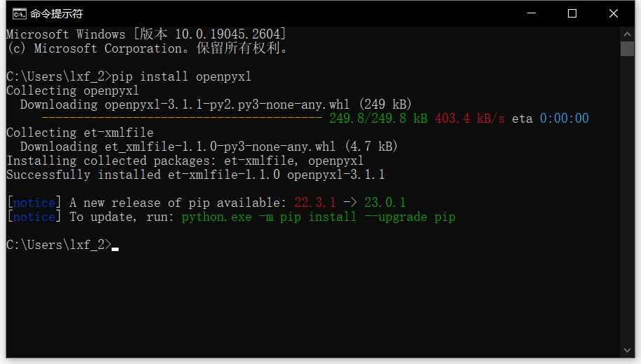 能够处理Excel文件的第三方库有不少,这里我们选用的是Openpyxl。开始之前请先安装它,操作极其简单。打开Windows的命令提示符窗口,执行“pip install openpyxl”命令即可(图22)。