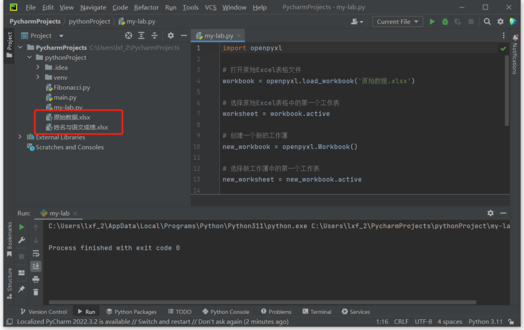需要注意的是,Openpyxl库只支持xlsx格式的Excel文件,不支持旧版的xls文件。万事俱备,接下来就可以PyCharm中编写Python程序了: