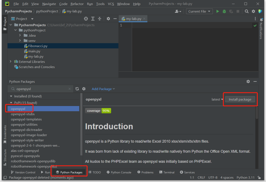 我们也可以在PyCharm中安装这个库。点击窗口底部的“Python Packages”选项打开一个窗格,然后在搜索框中输入“openpyxl”,找到之后点击右侧的“Install package”按钮即可安装(图23)。