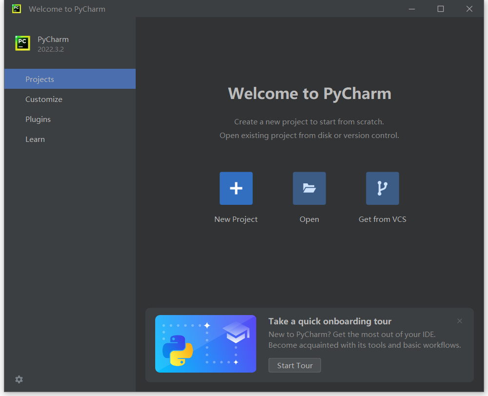 重启系统后,点击“开始”按钮,在开始菜单顶部的最近添加项中点击“PyCharm Community Edition 2022.3.2 ”启动PyCharm。第一次使用PyCharm需要进行一些设置,首先显示用户协议,只有勾选“I confirm that I have read and accept the terms of this User Agreement”(同意该协议)才可以继续。单击“Continue”按钮进入数据共享页面,如果不希望自己的数据被搜集,可以点击“Don’t Send(不发送)”按钮继续,进入PyCharm的欢迎界面(图11)。