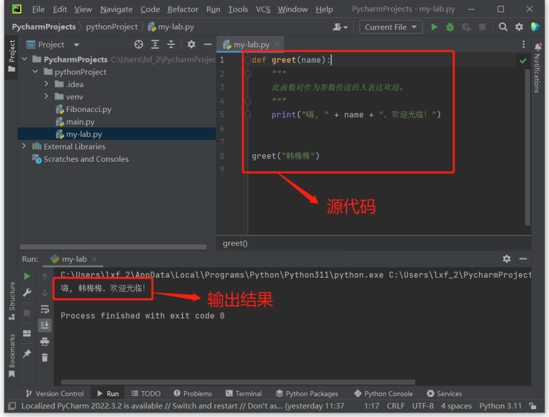 本例定义了一个名为greet的函数,它带有一个参数name,用于向函数传递一个名称。函数的主体包括一个打印语句,它将问候语与传递的名称一起打印。函数定义后,需要调用它才能够执行,所以代码的最后是函数调用语句,并传递了一个名称“韩梅梅”(图20)。