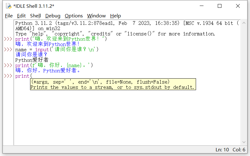 IDLE通过不同的颜色区分代码及执行结果,清晰明了。尤其方便的是,当我们输入某个函数时,它会智能显示参数提示,辅助我们输入代码,非常方便(图5)。
