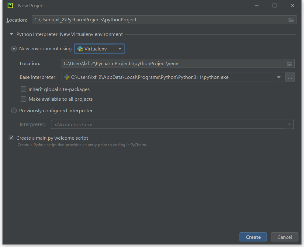 在“Projects”选项卡下点击“New Project”按钮新建一个项目,接下来设置新项目的保存位置和名称(Location)。另外我们还得给PyCharm选定一个Python解释器,本例中笔者勾选了“New environment using”项,选择“Virtualenv”,可以看到其所用的解释器正是前文所安装的Python.exe(图12)。