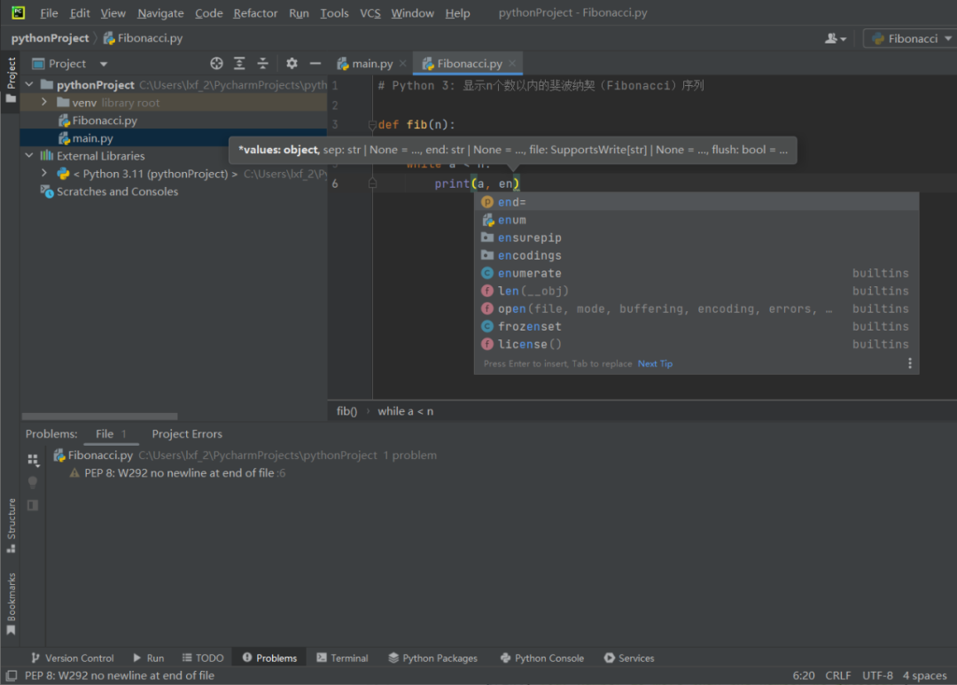 接下来为新文件取一个名称,我们继续以上文中的斐波纳契数列为例,所以将文件名设置为“Fibonacci”,按回车键回到主界面,输入上文中斐波纳契数列的示例代码,然后点击菜单命令“Run→Run”,在弹出的窗口中单击刚刚创建的“Fibonacci.py”即可运行它并在主界面下方显示出运行结果了。在手动输入代码时,能够明显感受到PyCharm的智能提示、自动补全、代码检查、快速修复等功能的强大,可以大大提高工作效率(图15)。