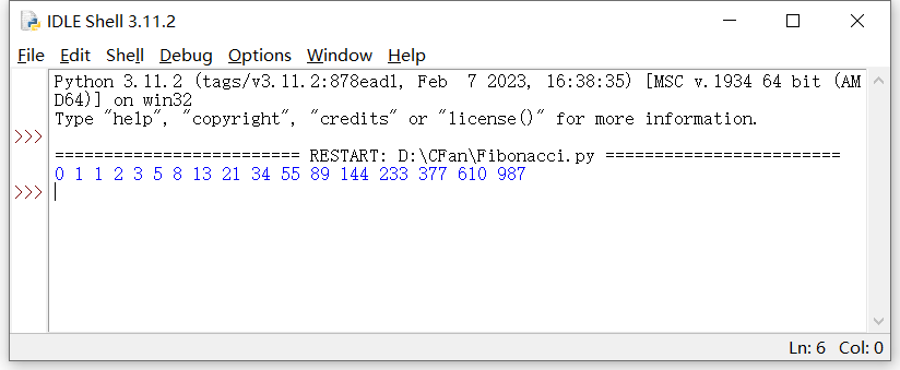 代码解释:“#”后面的文字表示注释,是程序员对代码的说明,这是给阅读代码的人看的,Python解释器会自动忽略这一行。接下来的“def fib(n):”定义了一个名为“fib”的函数,其后缩进的几行代码就是该函数的内容,其主体是一个“while”循环,通过斐波纳契数列公式反复运算,运算结果通过“print()”函数显示出来,其参数“end=’ '”表示每个数字后面加几个空格,是为了将数字隔开(用来显示的print函数在后面的示例中将频繁出现)。当然,函数定义只是表明此函数能做什么,真正运行还得对它进行调用,这就是最后一行代码“fib(1000)”的作用,在调用该函数时,传递了一个参数“1000”,表示要计算1000以内的斐波纳契数列(图6)。