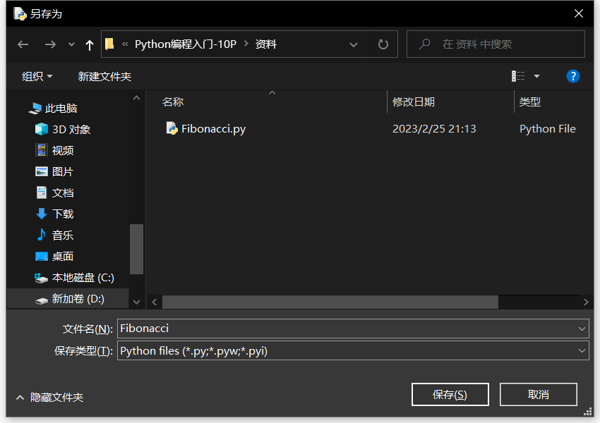 对于初学者来说可能还理解不了这段代码,没有关系,这正是后文要介绍的内容。现在按Ctrl+S键保存,在打开的保存对话框中输入文件名(本例取名为“Fibonacci”),这里无需手动添加“py”后缀,它会自动添加(图7)。