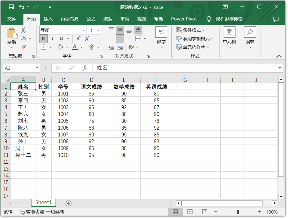 假设我们有一个记录全班同学考试成绩的原始Excel文件,其中包括每个人的姓名、学号及各科成绩的数据(图21)。现在因为某种需求,要把其中的“姓名”和“语文成绩”两列数据提取出来,单独保存为新的Excel文件。
