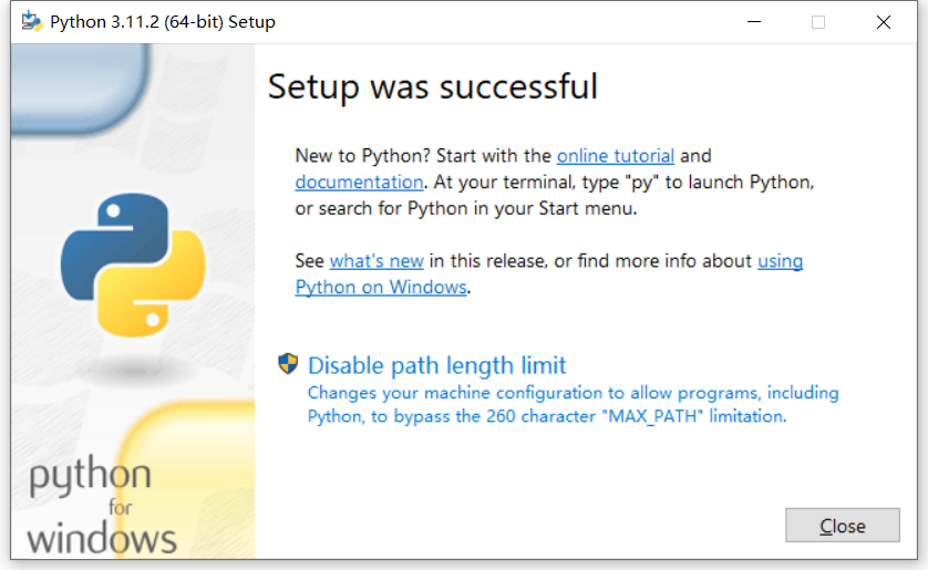 作为初学者选择默认安装选项即可。安装成功后,对于Windows系统将会有一个“Disable path length limit(禁用路径长度限制)”的提示,这是因为Windows系统能够处理的文件路径长度有一定的限制(图3)。点击禁用这一限制可以避免处理长文件路径时出现的调试问题,不过这也可能导致与旧版本Windows 10的兼容性问题。对于我们初学者来说可以暂时跳过此选项,因为以后有需要时还可以修改注册表来解决。